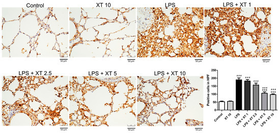 Macrophage infiltration in lungs following LPS-induced injury and Xanthoxylin treatment. Mice received LPS intratracheally and were treated with Xanthoxylin (XT, 1, 2.5, 5, and 10 mg/kg) or saline intraperitoneally. Lungs were harvested 6 h post-LPS challenge and immunostained with Mac-2 antibody (200× magnification, scar bar = 50 μm). Quantification of positive cells was analyzed under HPF. Data are mean ± SD (n = 6 per group). ### p < 0.005 vs. control group; *** p < 0.005 vs. LPS group.