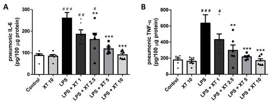 Levels of (A) IL-6 and (B) TNF-α in lungs after LPS challenge and Xanthoxylin treatment. Mice were given intratracheal LPS challenge followed by Xanthoxylin (XT, 1, 2.5, 5, and 10 mg/kg) or saline intraperitoneally. Lungs were harvested 6 h post-LPS challenge for ELISA. Data are mean ± SD (n = 6 per group). # p < 0.05, ## p < 0.01, ### p < 0.005 vs. control group; ** p < 0.01, *** p < 0.005 vs. LPS group.