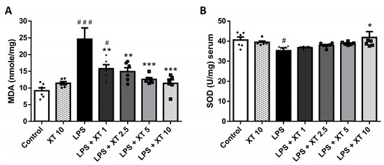 Levels of (A) MDA and (B) SOD in lungs after LPS challenge and Xanthoxylin treatment. Mice received intratracheal LPS challenge and were treated with Xanthoxylin (XT, 1, 2.5, 5, and 10 mg/kg) or saline intraperitoneally. Lungs were collected 6 h post-LPS challenge for oxidative stress assays. Data are mean ± SD (n = 6 per group). # p < 0.05, ### p < 0.005 vs. control group; * p < 0.05, ** p < 0.01, *** p < 0.005 vs. LPS group.