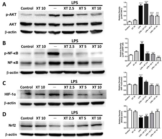 Effects of Xanthoxylin on expression of (A) Akt, (B) NF-κB, (C) HIF-1α, and (D) Nrf2 in lungs after LPS challenge. Mice were administered Xanthoxylin (XT, 2.5, 5, and 10 mg/kg) or saline intraperitoneally 30 min post-LPS challenge. Lungs were harvested 6 h later for Western blot analysis. Data are mean ± SD (n = 6 per group). ## p < 0.01, ### p < 0.005 vs. control group; * p < 0.05, ** p < 0.01, *** p < 0.005 vs. LPS group.