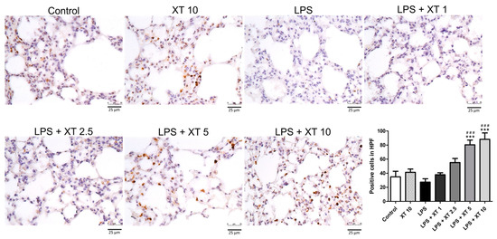 Nrf2 expression in lungs after LPS-induced injury and Xanthoxylin treatment. Mice received intratracheal LPS challenge followed by Xanthoxylin (XT, 1, 2.5, 5, and 10 mg/kg) or saline intraperitoneally. Lungs were collected 6 h post-LPS challenge and immunostained with Nrf2 antibody (400× magnification, scar bar = 25 μm). Quantification of positive cells was analyzed under HPF. Data are mean ± SD (n = 6 per group). ### p < 0.005 vs. control group; *** p < 0.005 vs. LPS group.