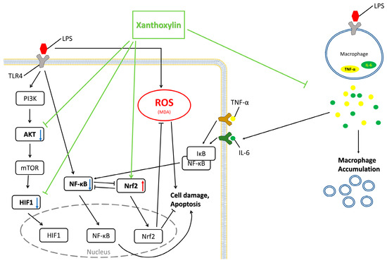 As shown in Figure 10, LPS binds to Toll-like receptor 4 (TLR4), transmitting the signal to PI3K and subsequently to AKT [44,45]. TLR4 also directly influences NF-κB [45,46]. AKT, a pivotal hub in a signaling network, is commonly associated with inflammatory activation and activates HIF1 via mTOR [47,48]. NF-κB and Nrf2 antagonize each other and regulate apoptosis [49]. HIF1, sensitive to oxidative stress, can be affected by ROS [50]. Macrophages capture LPS, increasing TNF-α and IL-6, which enhance NF-κB signaling through alveolar cell receptors [29,46]. Figure 10 demonstrates the protective effects of Xanthoxylin’s effects on AKT, HIF1, and Nrf2, as well as its inhibition of TNF-α and IL-6.