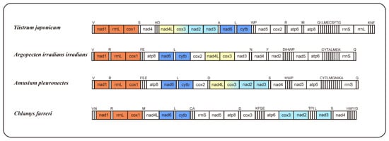Gene orders of Ylistrum japonicum, Argopecten irradians irradians, Amusium pleuronectes, and Chlamys farreri, with newly annotated atp8 genes. The same color indicates identical gene junctions (excluding the tRNA genes).