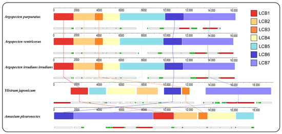Gene collinearity analysis using the progressiveMauve algorithm in Mauve has identified seven locally collinear blocks (LCBs) across the complete mitochondrial genome of five Pectininae species (Figure 3). These LCBs are conserved across all mitogenomes analyzed, although variations in the sequence order are evident among the different species. The arrangement of LCBs demonstrated a high degree of similarity among the three Argopecten species, indicating their close evolutionary relationship. In contrast, Y. japonicum exhibited a significantly dissimilar LBCs arrangement compared to three Argopecten species and A. pleuronectes.
