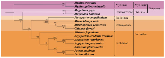Waller’s [30] hypothesis for the classification and evolution of Pectinidae is based on morphology, particularly focusing on pre-radial stage shell microsculpture and incorporating fossil data and geological evidence. In 2006, Waller updated his Pectinidae phylogenetic hypothesis in conjunction with previous molecular genetic studies about the phylogenies analysis of the Pectinidae, and a stable classification method was successfully established. Much of the contemporary taxonomic research on Pectinidae is grounded in the taxonomy framework developed by Waller, as evidenced by the work of Serb [6] and Smedley et al. [28]. With the continuous development of molecular technology and the expansion of fossil evidence, phylogenetic studies of Pectinidae have been further improved; however, controversies over the correct classification of this family remain.