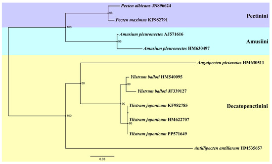 The genus Ylistrum, a member of the phylum Mollusca, class Bivalvia, order Pectinoida, family Pectinidae, was established by Mynhardt et al. [1] in 2014 and is derived from the Greek word “ylistro”, meaning “glide”, reflecting the gliding habits of this group, and dividing the original genus Amusium into two genera, Ylistrum and Amusium. Both Ylistrum and Amusium are primarily found in the Indian–Pacific region and exhibit similar lifestyles and morphological characteristics [1,2,3]. Despite these similarities, the evolutionary relationships and placement of Ylistrum within the family Pectinidae are not conclusively determined. Molecular phylogenetic studies have indicated that the Ylistrum species is genetically distinct from its close relatives in the genus Amusium studied by Alejandrino et al. [4], Mynhardt et al. [1], and Sherratt et al. [5] who support this genetic separation. However, the precise phylogenetic placement of Ylistrum within the family remains a topic of debate. Serb [6] proposed that the Ylistrum might belong to the tribe Decatopectinini, but this suggestion has not been strongly supported by available evidence due to insufficient molecular data [1].
