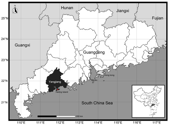A total of 50 specimens were collected from 2022 to 2023 from Hailing Island, Yangjiang City, Guangdong Province, China (21.61 N, 111.93 E) (Figure 6). Morphometric measurements were performed using an electronic vernier caliper (0.1 mm), and body measurement traits (shell length, shell height, shell width, shell weight, etc.) were recorded for further investigation. All collected samples were intended for commercial purposes, and there were no concerns regarding animal ethics. The morphological characteristics of these specimens were categorized and compared in accordance with Zhang et al. [38] and Zhang [44].
