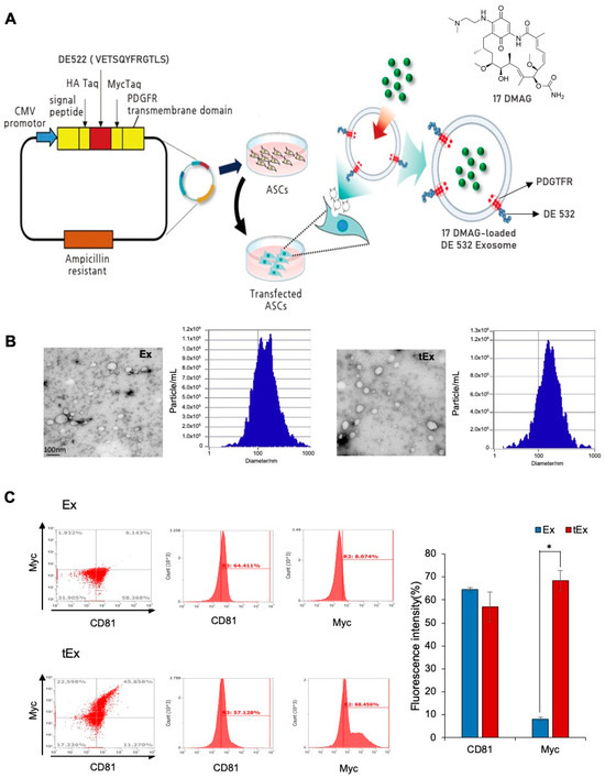 Generation and characterization of 17DMAG-loaded DE532 exosomes. (A) Schematic representation of the process for engineering 17DMAG-loaded DE532 exosomes. (B) Transmission electron microscopy (TEM) images comparing the morphology of exosomes obtained from non-transfected ASCs (Ex) and exosomes obtained from transfected ASCs (tEx). No apparent visual differences in the nanoparticle-like structures were observed between the two groups. (C) Flow cytometry analysis comparing the expression of the exosome marker CD81 and the Myc marker (indicative of DE532 peptide expression) in Ex and tEx. CD81 was expressed at 64.2% in Ex and 53.4% in tEx, while the Myc marker was expressed at 8.1% in Ex and 63.6% in tEx, confirming that tEx possess exosome characteristics and carry the DE532 peptides. Note: * p < 0.05.