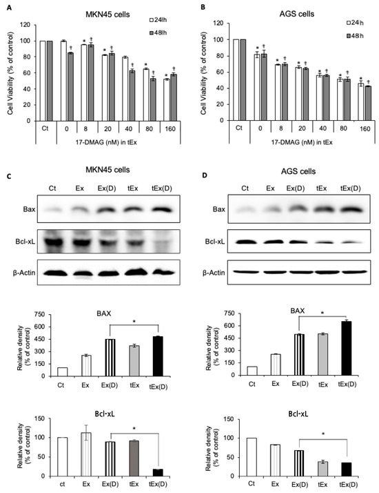Ex and tEx loaded with 50 nM 17-DMAG via electroporation were designated as Ex(D) and tEx(D), respectively. To investigate the antitumor effects of tEx(D), two types of gastric cancer cell lines, MKN45 and AGS, were treated with varying concentrations of 17-DMAG encapsulated into the exosomes, and the viability of the cancer cells was assessed using an MTT assay. The results revealed that tExo(D) caused a concentration- and time-dependent decrease in the viability of the MKN45 cells (Figure 2A). This trend was more pronounced in the AGS cells (Figure 2B).