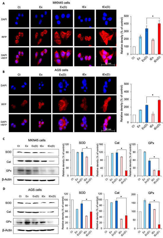 Furthermore, the expression of antioxidant enzymes in each cell line after treatment was compared using Western blot analysis. In the MKN45 cells, the treatment with tEx(D) resulted in the lowest expressions of superoxide dismutase (SOD), catalase, and glutathione peroxidase among all groups (Figure 3C). Similarly, in the AGS cells, the tEx(D) group exhibited the lowest expression of the antioxidant enzymes (Figure 3D).