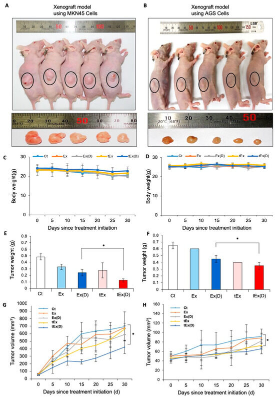 In vivo anticancer effects of 17DMAG-loaded DE532 exosomes. Comparison of tumor sizes (A,B), average mice weight (C,D), tumor weights (E,F), and tumor volume over time (G,H), showing that the tEx(D) group exhibited the smallest values among all groups in the gastric cancer xenograft mouse models generated by MKN45 (A) and AGS (B) cells. black circle: The location where cells are implanted. Note: * p < 0.05.