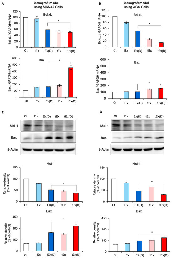 To examine apoptosis following each treatment, tumor tissues were extracted, and real-time polymerase chain reaction (PCR) was conducted. Using real-time PCR, we investigated the mRNA changes in the apoptosis-related markers within the tumor tissues obtained from each treatment group. In the MKN45 cell xenograft model, treatment with tEx(D) significantly upregulated the expression of the pro-apoptotic marker Bax and downregulated the expression of the anti-apoptotic marker Bcl-xL to the greatest extent (p < 0.05) (Figure 5A). Similar trends were observed in the AGS cells (p < 0.05) (Figure 5B). Subsequently, Western blot analysis was performed to assess the changes in the apoptosis-related proteins within the tumor tissues obtained from each treatment group. In the MKN45 cell xenograft model, the tEx(D) treatment significantly upregulated the expression of Bax and downregulated Bcl-xL compared to the other treatment groups (p < 0.05) (Figure 5C). This pattern was also observed in the AGS cells (p < 0.05) (Figure 5D).