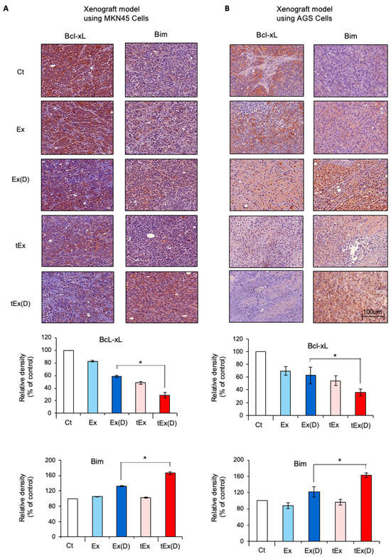 Immunohistochemical stains showing expressions of apoptosis-related markers. Immunohistochemical staining of tumor tissues obtained from the MKN45 (A) and AGS (B) cell xenograft models demonstrated that the tEx(D) treatment resulted in the most significant increase in the expression of the pro-apoptotic marker BIM and the most substantial decrease in the expression of the anti-apoptotic marker Bcl-xL. Note: * p < 0.05.