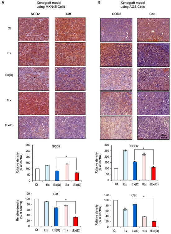 Immunohistochemical stains showing expressions of antioxidant enzymes. Immunohistochemical staining of tumor tissues obtained from the MKN45 (A) and AGS (B) cell xenograft models demonstrated that the tEx(D) treatment led to the most significant reductions in the expressions of SOD2 and catalase. Note: * p < 0.05.
