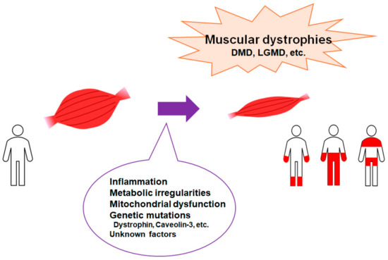 Representation of the critical factors for the development of muscular dystrophies. Muscular dystrophies are a group of illnesses that trigger the progressive loss of muscle mass. Several genetic mutations are well known for interfering with the production of molecules required to develop healthy muscle. There are various types of muscular dystrophy. Abbreviations: DMD—Duchenne muscular dystrophy; LGMD: limb–girdle muscular dystrophy.