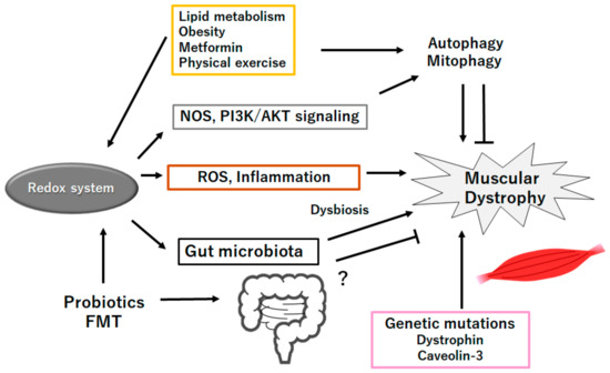The human gut may emerge to be a key organ of bacterium–host communication for the homeostasis of physical health. In addition to its function as a digestive organ, the human gastrointestinal tract is a home of complexed gut microbiota that consists of more than 100 trillion participants [81]. It is well known that gut microbiota may employ various metabolic and/or immunogenic interactions, which could influence many biological activities including enteric protection and/or immune barrier function. Robust cross-talks between gut microbiota and host organs may be an imperative feature of physical homeostasis. Various studies have also emphasized the relationship between gut microbiota and skeletal muscle of muscular dystrophy [82]. In addition, the gut microbiota may play a crucial role in regulating several immune responses, which might influence the pathology of muscular dystrophy. Therefore, the modulation of gut microbiota could contribute to the improvement of muscular dystrophy partly by influencing the expression of genes involved in immune cells-dependent inflammatory reactions [83]. In particular, dysbiosis, known as disruptions of gut microbial composition, may be connected to several immune-mediated and/or autoimmune diseases [84]. In other words, the intricate interactions between the gut microbiota and immune cells are strictly regulated, and dysfunctions in this communication system could lead to several inflammatory conditions [85], which might affect the progression of muscular dystrophy. However, the commensal population comprising the microbiota may extensively diverge among individuals intensely affected by immune responses and/or host genotypes [86]. Additionally, the microbiota is implicated in the development of obesity and diabetes, which could link the gut to systemic insufficient inflammation and/or different muscular adipogenic pathways [87]. Moreover, the quality of bacterial species in the gut microbiota may precisely influence the development of inflammation and/or adiposity in individuals [88]. Interestingly, some studies have correlated the gut microbiota with lifetime cardiovascular risk [20,89]. Short-chain fatty acids (SCFAs) are metabolites made by the gut microbiota with a key role in immune regulation. For example, acetate can enhance the killing activity of macrophages to Streptococcus pneumoniae in an NO-dependent manner [90]. In addition, acetate could commonly improve the bactericidal activity of macrophages. Acetate-induced NOS expression and increased NO production has been revealed in endothelial cells, which are also linked to inflammatory cytokine production [91]. These findings may emphasize the requirement to identify strategies targeting the gut microbial system for the treatment of muscular dystrophies. In-depth analyses of the functional relationship between food and microbiota composition may also contribute to the strategy against various human diseases. Possibly, these diseases may be associated with conditions that indorse intestinal dysbiosis with other pathologic circumstances. For instance, an inactive lifestyle has malicious effects on microbial composition, which may also influence treatments of patients with Duchenne muscular dystrophy [92]. Similar to human patients with the muscular dystrophy, mdx mice may also exhibit amplified gut peristalsis and relatively decreased fecal excretion [93,94,95,96]. Gut microbiota dysbiosis, characterized by reduced microbial diversity and/or increased maleficent bacteria, has been observed in mdx mice. Dysbiosis may cause gut inflammation and immune dysregulation, which can exacerbate the muscle damage of Duchenne muscular dystrophy [97]. Therefore, an improved strategy targeting gut dysbiosis could help to reduce the relevant inflammation and/or could eventually rescue muscle strength [98]. Studies have confirmed the probiotic and anti-gut inflammatory properties in mice fed with high fat diet [99]. Come to think of this, gut microbiota could play a crucial role in connecting food intervention with disease improvement, as the gut could absolutely be influenced by some diets, which should be worth exploring. The potential clinical utility of these diet modifiers would apply into distinct phenotypes of muscular dystrophies in the future. Interestingly, it has directed the clinical heterogeneity of Duchenne muscular dystrophy by stratifying based on the seriousness of muscle dysfunction [100].