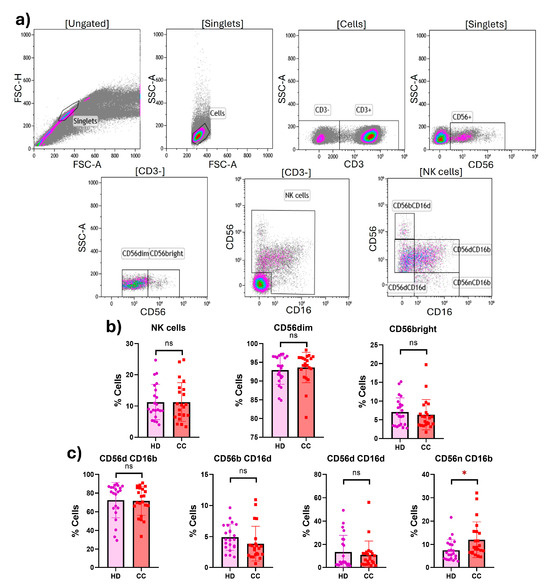 Percentages of peripheral NK cells from HD and CC patients. (a) Gating strategy for the peripheral NK cell flow cytometry analysis in PBMCs from HD (n = 22) and CC patients (n = 22). Gated from the lymphocyte region in the singlet population, NK cells were determined as CD3-CD56+ and classified as CD56dim and CD56bright NK cells. NK cells were further subdivided into four different subsets based on the expression of CD56 and CD16: CD56dimCD16bright, CD56brightCD16dim, CD56dimCD16dim, and CD56negCD16bright NK cells. (b) Percentages of total NK cells, CD56dim, and CD56bright NK cells in PBMCs from HD and CC patients. (c) Percentages of CD56dimCD16bright, CD56brightCD16dim, CD56dimCD16dim, and CD56negCD16bright NK cells in PBMCs from HD and CC patients. p-value: * p < 0.05; ns: non-significant.
