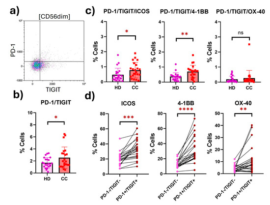 Expression of costimulatory receptors in peripheral exhausted CD56dim NK cells from HD and CC patients. (a) Representative dot plot of the exhausted population (PD-1+TIGIT+) CD56dim NK cells from CC patients. (b) Putatively exhausted CD56dim NK cell population from HD and CC patients. (c) Coexpression of costimulatory receptors in the putatively exhausted CD56dim NK cells. (d) Differential coexpression of costimulatory receptors in putatively exhausted (PD-1+TIGIT+) compared to non-exhausted (PD-1-TIGIT-) CD56dim NK cells from the same patients. p-value: * p < 0.05; ** p < 0.01; *** p < 0.05; **** p < 0.01; ns: non-significant.