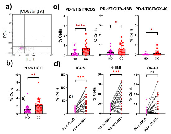 Expression of costimulatory receptors in peripheral exhausted CD56bright NK cells from HD and CC patients. (a) Representative dot plot of the exhausted population (PD-1+TIGIT+) CD56bright NK cells from CC patients. (b) Putatively exhausted CD56bright NK cell population from HD and CC patients. (c) Coexpression of costimulatory receptors in the putatively exhausted CD56bright NK cells. (d) Differential coexpression of costimulatory receptors in putatively exhausted (PD-1+TIGIT+) compared to non-exhausted (PD-1−TIGIT−) CD56bright NK cells from the same patients. p-value: * p < 0.05; ** p < 0.01; *** p < 0.005; **** p < 0.001; ns: non-significant.