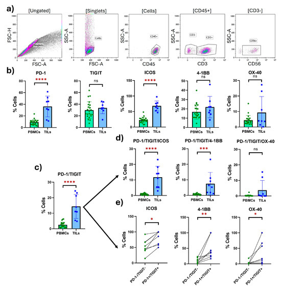 Multiparametric flow cytometry was used to analyze the expression of inhibitory (PD-1 and TIGIT) and costimulatory receptors (ICOS, 4-1BB, and OX-40) in NK cells (CD3-CD56+). In the case of TILs, a CD45 antibody was added to the cocktail to discriminate immune cells from other cells forming the tumor. Viability was evaluated in every sample in an independent staining using Zombie NIR™, and every sample showed a viability higher than 90%. The following antibodies were used to stain 5 × 105 cells: CD3-FITC (fluorescein isothiocyanate) (Biolegend, San Diego, CA, USA; cat: 300406); CD56-PE/Cy7 (phycoerythrin/cyanine 7) (Biolegend, San Diego, CA, USA; cat: 362510); CD16-PerCP/Cy5.5 (peridinin chlorophyll/cyanine 5.·5) (Biolegend, San Diego, CA, USA; cat: 302028); CD45-AF700 (Alexa Fluor 700) (Biolegend, San Diego, CA, USA; cat: 304024); ICOS-APC (allophycocyanin) (Biolegend, San Diego, CA, USA cat: 313510); 4-1BB-PE (phycoerythrin) (Biolegend, San Diego, CA, USA; cat: 309804); OX-40-APC/Fire750 (allophycocyanin/fire 750) (Biolegend, San Diego, CA, USA; cat: 350032); PD-1-BV421 (brilliant violet 421) (Biolegend, San Diego, CA, USA; cat: 329920); TIGIT-BV510 (brilliant violet 510) (Biolegend, San Diego, CA, USA; cat: 372738); and Zombie NIR Fixable Viability Kit (Biolegend, San Diego, CA, USA cat: 423105).