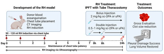 The development of the RH model (Figure 1) was initiated by harvesting blood from donor rabbits. The homologous blood was mixed with citrate (1 mL of 5% citrate: 6 mL of blood) until RH induction. A chest tube was surgically placed in the right pleural space of each experimental rabbit, while CT was used to confirm placement and visualize the presence of iatrogenic pneumothorax. To induce a RH, the harvested citrated homologous blood was recalcified (CaCl2 10 mM), supplemented with thrombin (0.3 U/mL), and immediately delivered into the pleural space via the placed chest tube. RH injury induction was performed in three delivery schedules (Figure 1, blood drops) to simulate continuous extravascular bleeding in the pleural space, delivering a total of 120 mL. A single chest tube was placed for the duration of each experiment, from the induction of RH through day 8 when the effects of the interventional agents were assessed. The chest tube was maintained via vest placement, and patency was maintained by performing a saline flush daily. The RH injury was monitored via chest ultrasonography.