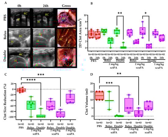 Retained clot size evaluation after treatment with IPFT. (A) Representative sonographs demonstrate the presence of clot before (0) and after (24 h) treatment with PBS (negative control), bolus, or double injection of fibrinolytics. Gross images taken postmortem show the presence of retained clot (RC) and lung (L) in the pleural space. (B) Based on sonographic imaging and using the distance measurement tool (Logiq e, R10 v1.3, GE Healthcare, Chicago, IL, USA), we measured the 2D Clot area (cm2) in the pleural space of rabbits before (0 h) and after treatment (24 h) with either PBS, 2 mg/kg sctPA (Bolus or Double delivery), 2 mg/kg scuPA (Bolus or Double delivery), or 1 mg/kg scuPA (Double delivery). (C) Using the same raw data set, the percent decrease in clot size was calculated between 0 h and 24 h. (D) The clots were harvested postmortem and measured using volume displacement method as described in material and method section. Clot volume data for 2 mg/kg sctPA (Bolus) and scuPA (Bolus) have limited data points as clots were preserved in situ at the beginning of the project to visualize the clot–lung adherence via histology. Kruskal–Wallis test with Dunn’s multiple comparison test was used to determine statistical significance for all data sets. A p < 0.05 was represented as *, p < 0.01 as **, p < 0.001 as ***, and **** as p < 0.0001.