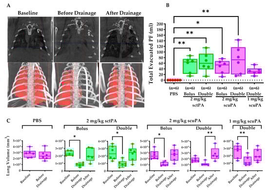 Evaluation of lung restriction and expansion via CT. (A) Representative CT images (coronal view) of the rabbit thorax before RH induction (baseline) and before and after drainage at 24 h post-treatment are shown. Rabbits treated with PBS failed to drain. Therefore, these rabbits did not undergo a post-drainage scan. (B) Total evacuated PFs were calculated by summing the PF volumes drained at 8 h and 24 h; moreover, failure to drain any PFs from the rabbits were assigned a value = 0. (C) Vivoquant Studio 3.0 was used to calculate the 3D rabbit lung volume (mm3) for each treatment group at baseline (before induction of RH), before drainage, and after drainage. The Kruskal–Wallis or Friedman test with Dunn’s multiple comparison test was used to determine the statistical significance between treatment groups. A p < 0.05 was depicted as * and p < 0.01 as **.