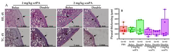 Histological evaluation of the rabbit pleural lining after treatment with IPFT. (A) Injured lung tissue from each rabbit subject were stained with Hematoxylin and Eosin Stain (A1–A4) to visualize pleural thickening (black arrows, 1 mm scale) and Masson Trichrome Stain (A5–A8) to visualize the overexpression of collagen (blue lining, 1 mm scale) in the pleural lining. (B) Morphometry quantified the extent of pleural thickening from each rabbit treated either PBS, sctPA, or scuPA. The Kruskal–Wallis test with Dunn’s multiple comparison determined the statistical significance between treatment groups. A p > 0.05 demonstrated no statistical significance (not shown).