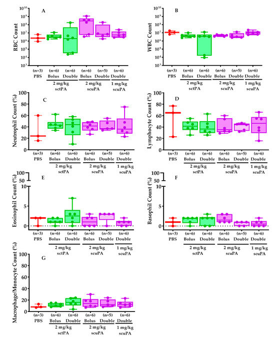 There were no significant differences in total WBC counts (Figure 5B) in PFs from rabbits with RH exposed to PBS or various dosing regimens of scuPA or sctPA. Neutrophil counts (Figure 5C) in the scuPA and sctPA treated groups were slightly elevated compared to the PBS-treated group, while lymphocyte counts (Figure 5D) were slightly reduced in both scuPA and sctPA groups compared to PBS. Eosinophil (Figure 5E), basophil (Figure 5F), and macrophage/monocyte (Figure 5G) counts were consistent across all groups.