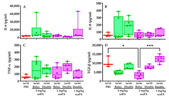 Pro-inflammatory (IL-6, IL-8, TNFα) and anti-inflammatory (TGF-β) cytokines in PFs were assessed via ELISA explore the role of these cytokines in regulating the expression of plasminogen activator inhibitor-1 (PAI-1), a major PA inhibitor, and to understand the changes in immune response, inflammation, and tissue repair upon RH treatment. Our findings indicated that IL-6 (Figure 6A), IL-8 (Figure 6B) levels were consistent across all groups. TNF-α levels were slightly elevated in groups that received double doses of both sctPA and scuPA compared to others (Figure 6C). TGF-β levels for the bolus 2 mg/kg dose of scuPA were significantly lower than those for PBS and the double dose of scuPA (1 mg/kg). Moreover, double doses of both sctPA and scuPA exhibited notably higher TGF-β expression than their respective bolus dose group (Figure 6D).