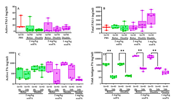 Intrapleural levels of plasminogen activators (tPA and uPA) and PAI-1 during IPFT of RH model. Levels of active (A) and total PAI-1 (B) in the PFs at 24 h were measured using ELISA as previously described [12,15]. Levels of active (C) and total antigen (D) PA (human tPA or uPA) in the RH PFs collected at 8 h and 24 h after administration pf the human PAs were measured by ELISA. The Kruskal–Wallis test with Dunn’s multiple comparison determined the statistical significance between treatment groups. A p < 0.01 was represented as **.