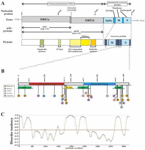 A schematic representation of the SARS-CoV-2 nucleocapsid protein (N protein). (A) The structural protein segment of the SARS-CoV-2 gene encodes for multiple proteins, including the spike (S1 and S2 subunits), envelop (E), membrane (M), and nucleocapsid (N) proteins. (B) The N protein, encoded by the 9th ORF, is a 419 aa protein of 46 kDa composed of three domains: the N-terminus region contains a prominent RNA binding domain (RBD), a C-terminus dimerization domain that facilitates N protein dimer formation, and a Ser/Arg-rich central flexible linker region (LKR). The NCP undergoes extensive post-translational modification (PTM), predominantly within IDRs. Note the relative paucity of PTMs in the RBD—a feature not commonly observed in the RBPs of ALS-associated RBPs. Methylation at R95 is required for stress granule formation, while F17 has been shown to be the critical interactor for G3PB1 [,,]. (C) The N protein contains three intrinsically disordered domains, including the N and C termini and the LKR (intrinsic disorder tendency predicted using PrDOS (protein disorder prediction system (https://prdos.hgc.jp/cgi-bin/result.cgi?ppid=387405p1d1696958772 (accessed on 10 October 2023)) and validated with UniProt (https://www.uniprot.org/uniprotkb/A0A2D1PX79) (accessed on 10 October 2023)). Modified from Strong, 2023 [].
