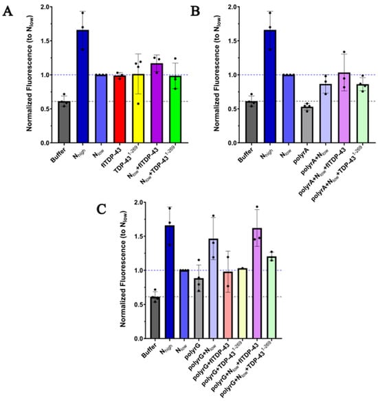 The relative aggregation of purified N and TDP-43 proteins in the absence of RNA (A), in the presence of polyrA (B), or in the presence of polyrG (C). Proteins and/or RNA were mixed at the same time in turbidity buffer with crowding reagent (10% dextran) and added to diluted Proteostat® aggregation detection reagent. The fluorescence shown was recorded with a plate reader approximately 30 min after initial mixing. N was mixed with the aggregate reagent at a high concentration (20–24 µM) or a low concentration (1–2.5 µM). N and full-length TDP-43 (flTDP-43) or N-terminus TDP-43 (TDP-431–269) were mixed at a molar ratio of 1:0.8. N was mixed with the RNA indicated at a molar ratio of 1:0.25. The same molar ratios were used in mixtures containing N, RNA, and TDP-43 variants. The fluorescence was normalized to the low N concentration (Nlow) used in each experiment. The data include on average three independent experiments with black dots showing these values.