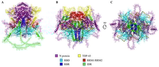 In summary, in silico modeling predicts that TDP-43 and the N protein will form a complex which, in the presence of RNA, becomes a more densely packed heteropolymer in which interactions are mediated through the N-CTD and the IDR of the C-terminus of TDP-43.