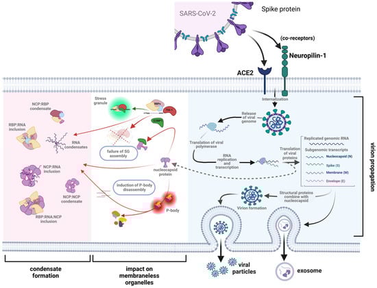 A schematic illustration of the role of the SARS-CoV-2 nucleocapsid protein (N protein) in driving pathological biomolecular condensate formation. Upon endocytosis of the SARS-CoV-2 virus and release of the viral genome, the N protein plays a critical role in the translation of the viral gRNA and the formation of the virion. The latter is released either through exocytosis or encapsulated in exosomes. However, the free N protein also inhibits the formation of stress granules (SGs) by directly interacting with G3BP1, which is critical to the initial assembly of the SG. Not shown is the proposed additive role of the N protein in leading to the disassembly of processing bodies (PBs). The net effects are the formation of pathological biomolecular condensates of varying composition: N protein homopolymers; N protein: RNA heteropolymers; N protein: RBP heteropolymers; and N protein: RNA: RBP heteropolymers. It is hypothesized that any or all of these pathological molecular condensates would play a critical role in the pathogenesis of the neuronal or glial cytoplasmic inclusions that are the neuropathological hallmark of a broad array of neurodegenerative disorders (figure modified from Strong, 2023 [] and created with BioRender.com).
