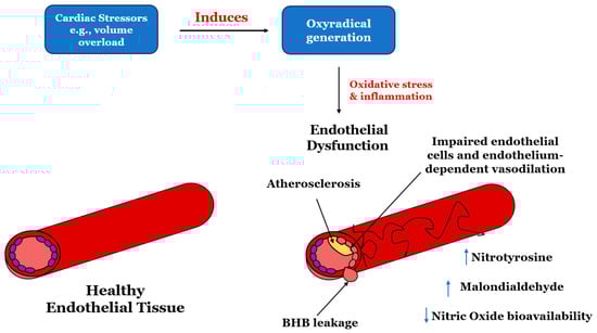 The impact of various cardiac stressors such as volume overload, hypertension, ischemia, etc. on oxyradical generation. For instance, chronic volume overload is a stressor that leads to oxyradical production, resulting in oxidative stress and inflammation. This stress impairs the endothelium’s ability to dilate in response to stimuli due to reduced nitric oxide availability. Endothelial dysfunction, characterized by impaired endothelium-dependent vasodilation, plays a significant role in the development of cardiovascular disorders, including heart failure. Notably, the endothelium’s capacity to dilate blood vessels is a critical predictor of cardiac mortality and hospitalization in individuals with HFrEF.