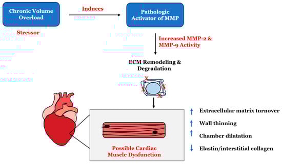 Chronic volume overload, an example of a cardiac stressor and pathologic activator of matrix metalloproteinases (MMPs), leads to the pathological remodeling of the extracellular matrix. In a failing myocardium, latent resident myocardial MMPs are activated, decreasing the elastin-to-interstitial collagen ratio. This, in turn, leads to the formation of an oxidized extracellular matrix. In HFrEF, the loss of fibrillar collagen reduces cardiomyocyte contraction, compromising systolic function.