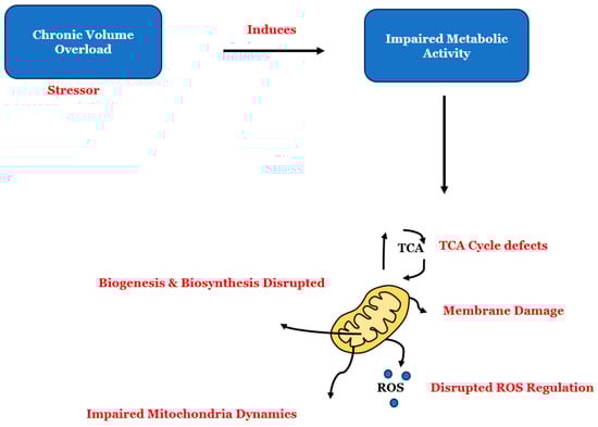 Chronic volume overload is an example of a cardiac stressor and disruptor of mitochondrial function. It affects mitochondrial metabolic activity, including dynamics and bioenergetics. This disruption is closely associated with mitochondrial fragmentation, often observed during high stress and cellular death. In heart failure with reduced ejection fraction (HFrEF), the damage to mitochondrial structure and function is particularly significant, indicating a continuous autophagy process.