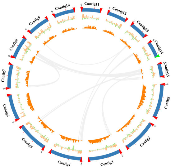 Raw sequencing data generated by the PromethION platform underwent quality assessment and were processed using Oxford Nanopore GUPPY (version 0.3.0) to eliminate unsuccessful reads. The remaining passed reads were used for further analysis. For genome assembly, the software NECAT (version v0.0.1) (https://github.com/xiaochuanle/NECAT) (accessed on 10 August 2024) was used for preliminary genome assembly, and Racon (version 1.4.11) was utilized for error correction based on ONT sequencing data for two rounds. Further, the software Pilon (version 1.23) was used for error correction based on Illumina sequencing data for two rounds [86]. The Circos graph of the genome was generated using the ‘Advanced Circos’ module of TBtools v 2.086 [87]. The heterozygosity of the genome was estimated based on analysis of k-mer depth distribution using Jellyfish5 [88] and GenomeScope6 [89] for Illumina data. The integrity of chromosome-level genome assembly was estimated by BUSCO [90].