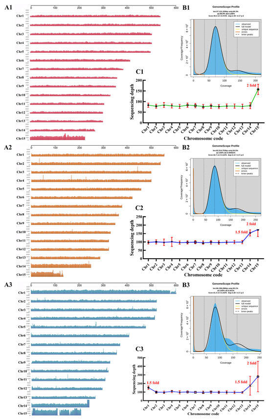 Sequencing depth for 15 chromosomes based on nanopore sequencing reads and k-mer analysis of different genomes based on Illumina sequencing reads of Wolfiporia hoelen. Sequencing depth of genome L7 (A1), Pr2C (A2), and PrT (A3). k-mer analysis results of genome L7 (B1), Pr2C (B2), and PrT (B3). Line charts of sequencing depth of different chromosomes for genome L7 (C1), Pr2C (C2), and PrT (C3).