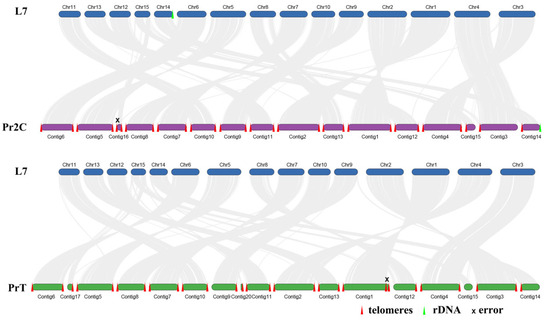 Compared to the SS20 genome we published previously as the highest quality genome [8], the number of contigs has significantly decreased from 78 to 27/28 contigs. The contig N50 was significantly extended from 3760 kb to over 4100 kb (Table 1). The complete chromosomes contain telomeres on both ends. Genome L7 (15 chromosomes) has more chromosomes than genome Pr2C (13 chromosomes), which has more chromosomes than genome PrT (11 chromosomes), and more chromosomes than genome SS20 (9 chromosomes) (Table S1). This demonstrates the higher quality of the newly assembled genomes compared to genome SS20. Meanwhile, the longest chromosome of the SS20 genome, anchored according to Hi-C data, was 7.47 Mb [8], significantly larger than the largest chromosome found here. This suggests that chromosome 1 of SS20 may have been incorrectly assembled.