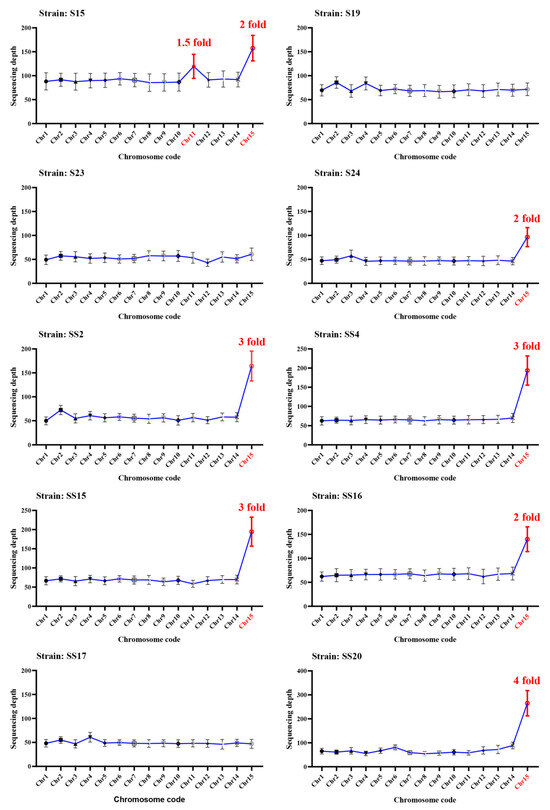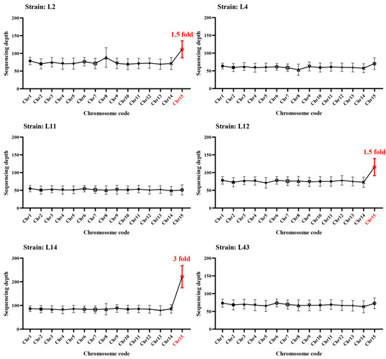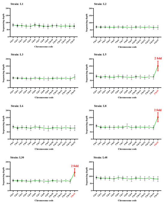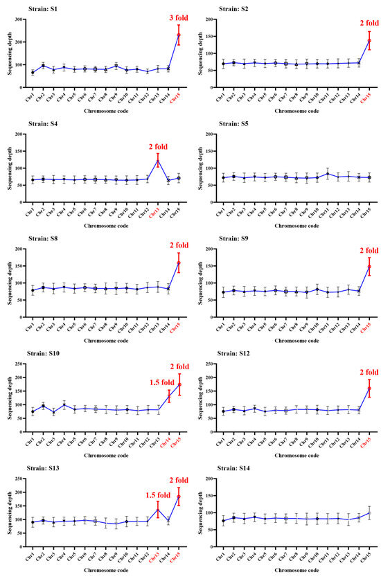 Eight homokaryotic offspring of strain L12 were further sequenced and analyzed. Among them, three of which have 2× sequencing depth for chromosome 15 compared to other chromosomes, while the other five strains exhibited a euploid genome with similar sequencing depth across all chromosomes (Figure 5). Meanwhile, twenty homokaryotic offspring of strain L14 were further sequenced and analyzed. Among them, fifteen strains exhibited aneuploid genomes, while five strains showed euploid genomes. Among the fifteen offspring strains with aneuploid genomes, some strains only exhibit one chromosome duplication. Specifically, ten strains have 2× sequencing depth for chromosome 15 compared to other chromosomes, four strains have 3× sequencing depth for chromosome 15 compared to other chromosomes, one strain has 4× sequencing depth for chromosome 15 compared to other chromosomes, and one strain has 2× sequencing depth for chromosome 13 compared to other chromosomes. Moreover, some strains have chromosome duplication for more than one chromosome. For strain S10, chromosome 14 has a sequencing depth of 1.5×, and chromosome 15 has a sequencing depth of 2×. For strain S13, chromosome 13 has a sequencing depth of 1.5×, and chromosome 15 has a sequencing depth of 2×. Lastly, for strain S15, chromosome 11 has a sequencing depth of 1.5×, and chromosome 15 has a sequencing depth of 2× (Figure 6).