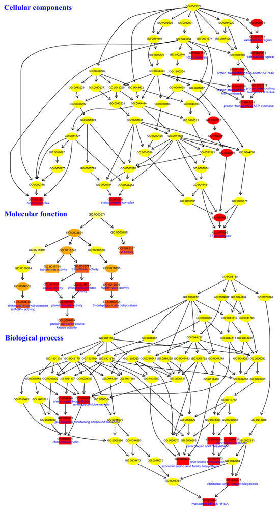 GO enrichment analysis of genes on chromosome 15. The rectangle represents enriched first ten GO items, and the ellipse represents other items. Red represents obvious enriched, followed by orange and yellow.