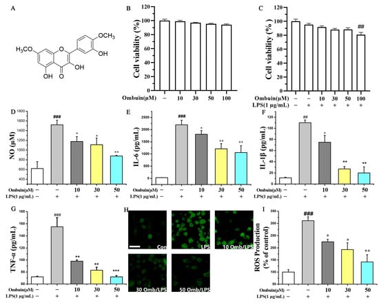 2.1. Ombuin Inhibited LPS-Induced Neuroinflammation in BV-2 Cells