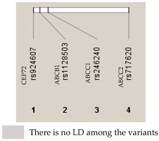 Genotyping was successful for all patients and SNPs included. The distribution of the studied SNPs followed the Hardy–Weinberg equilibrium (HWE) model between the expected and observed heterozygosity (Table S1). No evidence of linkage disequilibrium (LD) was observed among the SNPs (Figure 1). All of the SNPs exhibited a minor allele frequency (MAF) > 15%, and none were excluded from the study (Table S2).