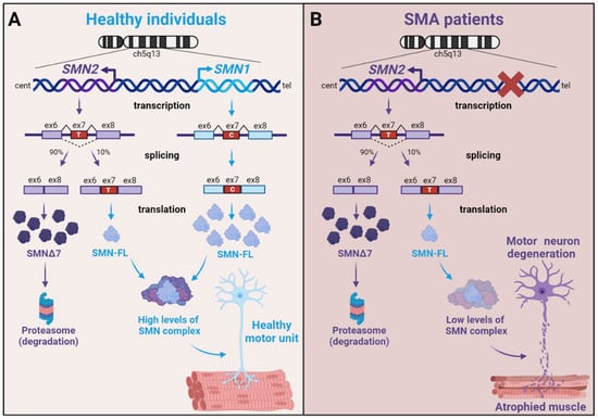 Generation of SMN transcripts from SMN1 and SMN2 genes. (A) In healthy individuals, SMN1 and SMN2 gene transcripts are translated into the full-length SMN (SMN-FL) and SMNΔ7 proteins, respectively. A small percentage of SMN2 is also translated into SMN-FL. (B) In SMA patients, transcripts from SMN1 are absent. Most SMN2 transcripts are translated into SMNΔ7 and mostly degraded. See the text for a more detailed explanation. Figure created with BioRender.com.