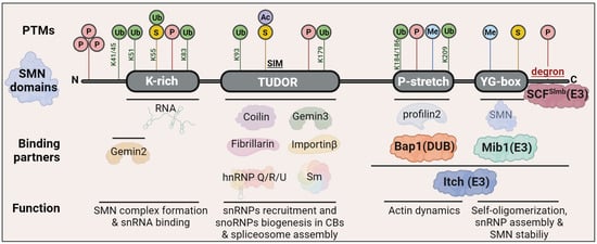 Diagrammatic representation of the domain structure of SMN-FL. The SMN protein comprises several highly conserved motifs: a basic lysine-rich domain (K-rich), a Tudor domain, a poly-L-proline-rich domain (P-stretch), and a Y/G box in close proximity to the C-terminus, that itself mediates self-oligomerization and stability. The SMN protein is highly modified through phosphorylation (P), methylation (Me), acetylation (Ac), SUMOylation (S), and ubiquitination (Ub). Depicted are a summary of sites modified by the indicated PTMs identified through MS/proteomics and other methods (see [] for a complete list of SMN PTMs sites). Some of the well-known proteins that interact with SMN-FL and the corresponding function are depicted below the corresponding interacting domain (see [] for a review on SMN interactors and functional implications). Also indicated are the known interaction sites of SMN with the E3 UBLs Mib1, Itch and SCFSlmb and the DUB Bap1 (see Section 7 for a detailed discussion). Figure created with BioRender.com.
