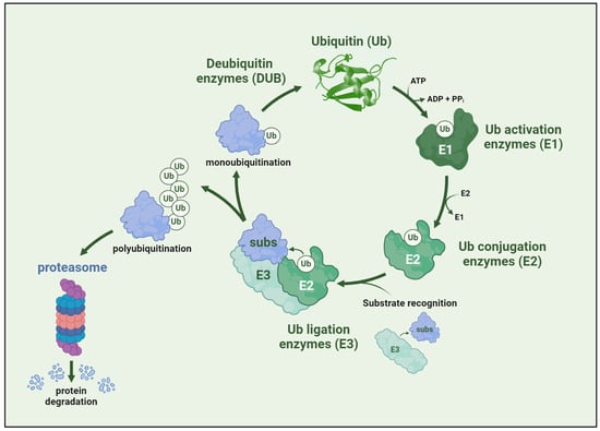 At the very core of the mechanisms directly implicated in muscle protein degradation during muscle atrophy progression, regardless of the underlying cause, lies ubiquitination, the master regulator of protein turnover. Ubiquitination is a posttranslational modification essential for keeping cellular homeostasis and functionality. The process is typically defined as the covalent binding of the protein ubiquitin (Ub) to a target protein (Figure 3). Nonetheless, this process has been described in other biomolecules, such a lipids [], although it is far less common than in proteins. Ubiquitin consists of 76 amino acids and is highly conserved among all eukaryotes; it was first described in 1975 [] and identified as a conjugated protein in 1977 []. Since then, other proteins have been identified to have a similar function and structure as ubiquitin, forming the ubiquitin-like protein family []. Nevertheless, ubiquitin seems to be the most relevant member of the family, as the ubiquitin–proteasome system mediates the large majority of protein degradation.