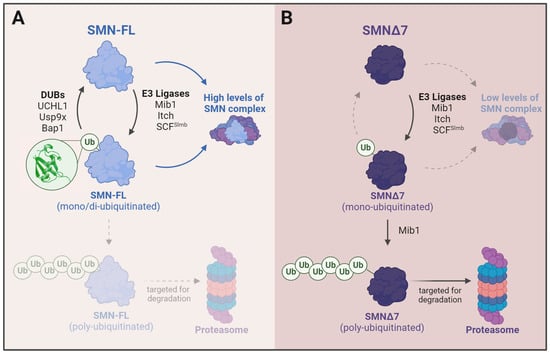Numerous factors belonging to the ubiquitin–proteasome system have been shown to regulate the stability and degradation of both SMN-FL and SMNΔ7 [,]. SMN has about twice the half-life of the truncated variant SMNΔ7 [], which can be explained by changes in the ubiquitination process of each protein. Thus, whereas SMN is mostly monoubiquitinated, SMNΔ7 is heavily polyubiquitinated, which likely promotes rapid proteasome degradation and would explain its short half-life [].