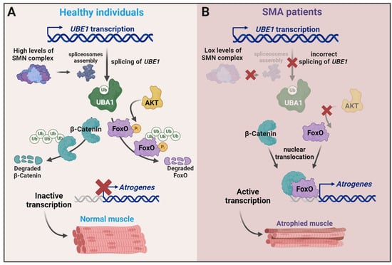 A model to explain the functional link between SMN levels and ubiquitination and the changes in SMA. (A) Functional SMN complexes and correct UBE1 splicing render normal levels of UBA1 protein, which drive the ubiquitination and degradation of β-catenin and block the transcription of atrogenes. AKT activation reinforces the effect by phosphorylating FOXO and making it more sensitive to ubiquitination by MDM2. (B) In SMA patients, reduced levels of SMN result in low levels of UBA1, the accumulation of undegraded β-catenin, and increased atrogene expression. Figure created with Biorender.com.